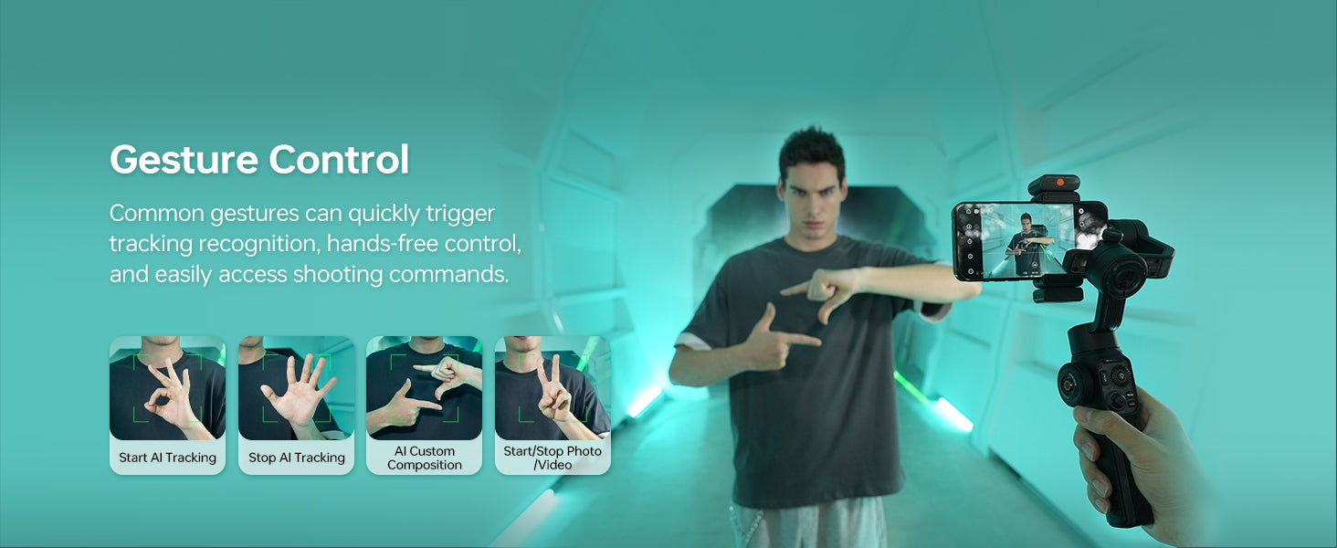 (1)AI Tracking Without App Needed – Start and stop smart subject tracking with just hand gestures – perfect for solo creators, vloggers, and on-the-go filmmakers.