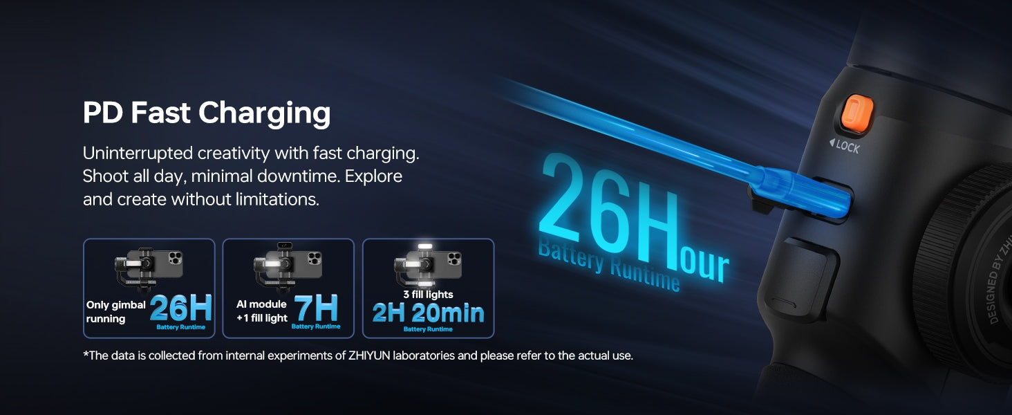(4)Massive 26H Battery Life with Fast Charging – Shoot all day with confidence and recharge quickly when needed – no creative downtime.