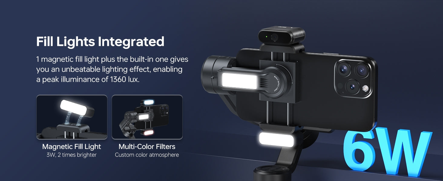 (3)Integrated + Magnetic Fill Light – Includes a powerful 6W built-in light and optional magnetic fill light (sold separately) for perfect lighting in every scene.