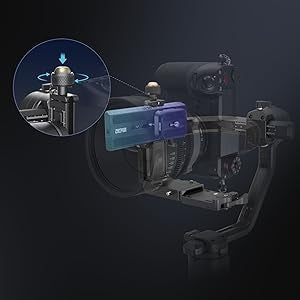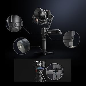 Multiple mounting points are available on the gimbal for creative adaptation: One 1/4" screw hole on the back of the quick release plate for the camera to shift between different devices such as sliders and tripods; Two 1/4" screw holes with crown gear and one 3/8" screw hole.