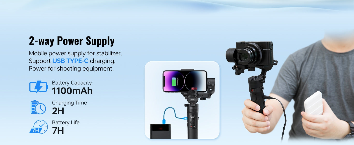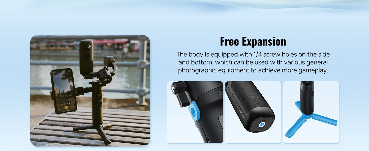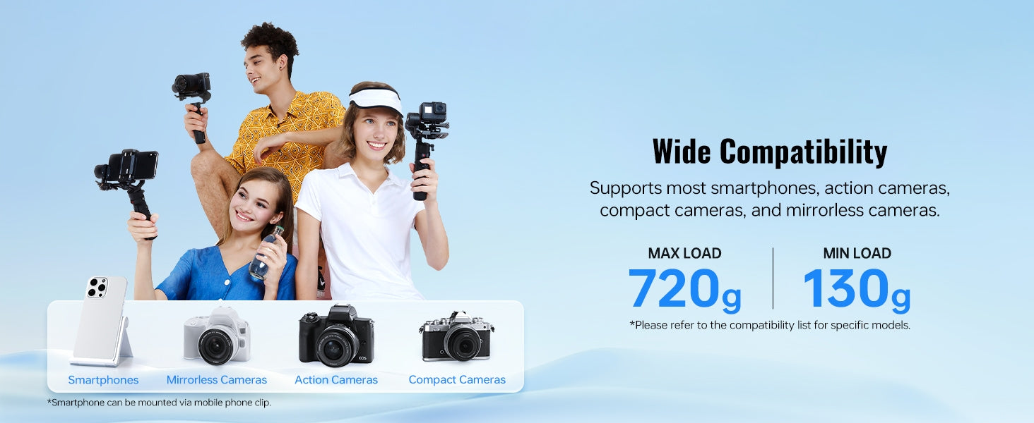(2)All-in-One Compatibility – Works with smartphones, action cams, compact and mirrorless cameras (max payload: 720g).